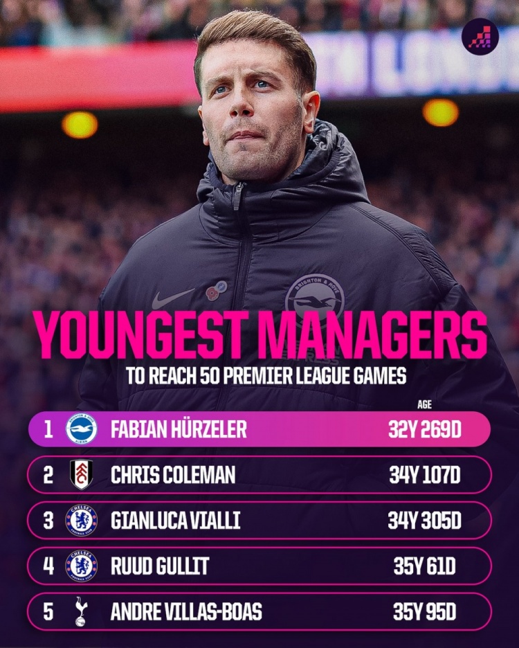 足球比分网11月20日讯 Opta统计了教练达成英超50场里程碑时的年龄,并列出英超执教50场最年轻主帅排名,赫尔泽勒居首。 英超执教50场最年轻主帅排名: 赫尔泽勒(布莱顿)——32岁269天 科尔曼(富勒姆)——34岁107天 维亚利(切尔西)——34岁305天 古利特(切尔西)——35岁61天 博阿斯(热刺)——35岁95天 |
