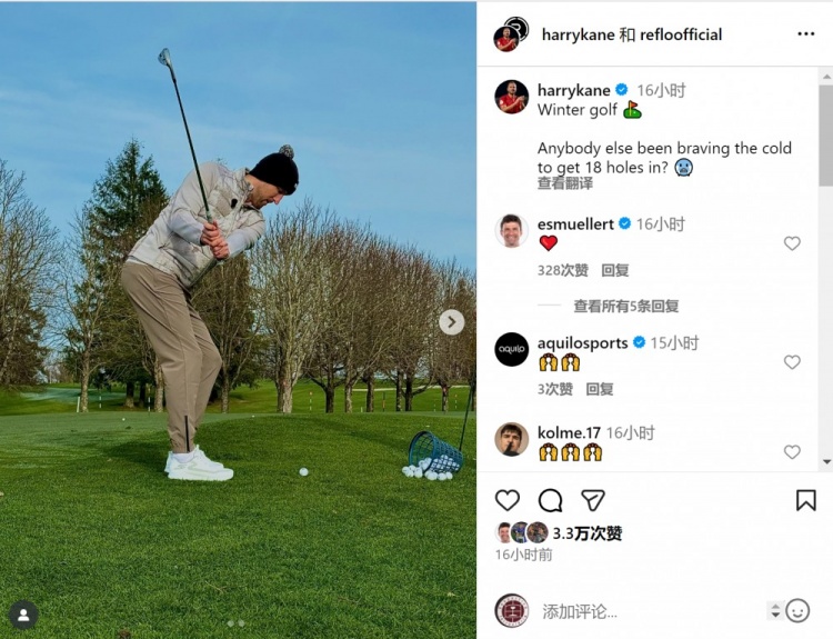 穆勒点赞!凯恩晒打高尔夫照片:还有谁顶着寒