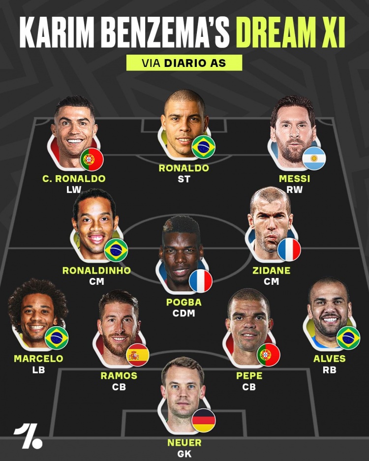 本泽马评最佳11人:大罗、C罗、梅西领衔锋线,