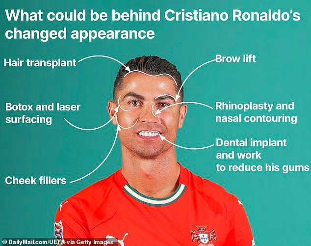 颧骨 C罗完美的高颧骨似乎也是如此,莱文博士认为其已被“增强”。"并非说他18、19岁时脸颊看起来不同,而是他没有变得更糟,”莱文博士解释道。 皮肤 然而,C罗无皱纹外貌的秘密可能不止于注射。莱文博士声称,提眉手术也可能帮助他在40岁时看起来比18岁更好。 莱文博士认为,C罗可能接受了内窥镜提眉手术,结合肉毒杆菌和可能的激光焕肤,使他看起来“干净、整洁、精神焕发”。 头发 而C罗当然拥有浓密的秀发来隐藏任何潜在的疤痕——但他可能还得感谢另一项手术。根据莱文博士的说法,他可能接受过PRP治疗(使用自身血小板浓缩液刺激毛囊并促进头发生长),甚至是轻微的植发手术。 “如果你看他的发际线,它100%没有变化,“莱文博士谈到C罗浓密的黑发时说。“仔细审视时,几乎没有任何变化。” “那么,有没有可能他拥有世界上最强大的头发基因?绝对可能。但也有可能他一路走来做了某种处理。” “真的看起来没有任何后移。即使是被描述为拥有强大头发基因的人,通常太阳穴也会稍微后移,形成一点美人尖。”