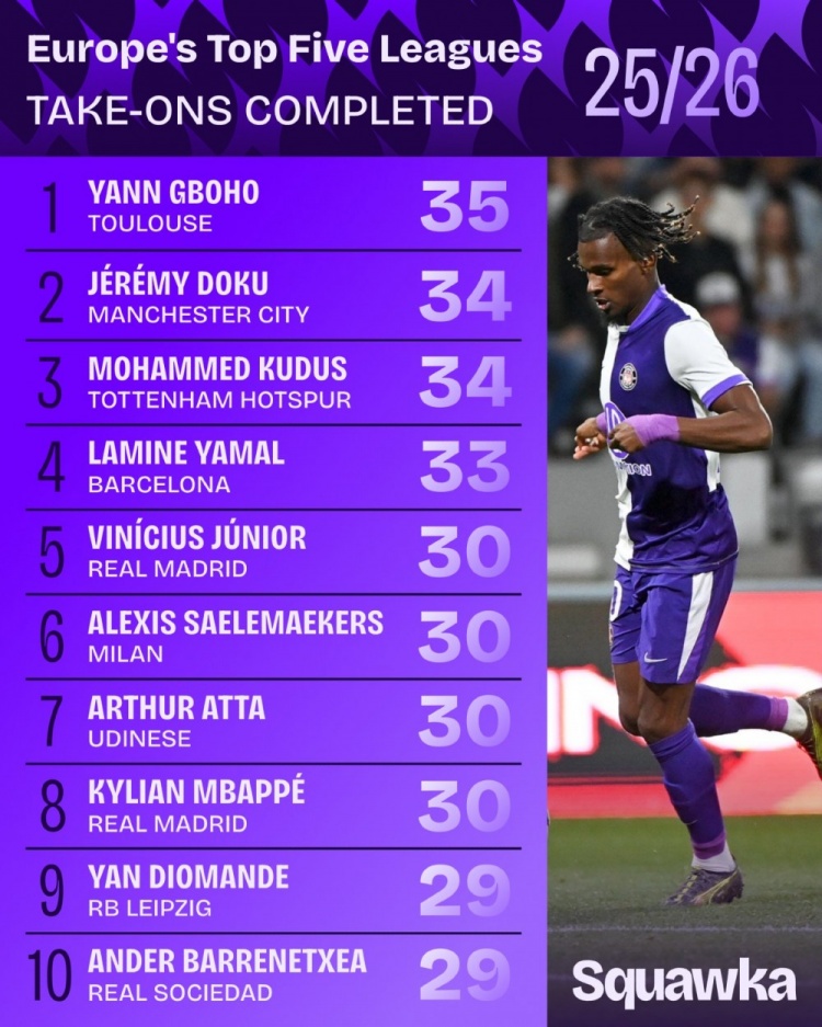 足球比分网11月21日讯 五大联赛战火即将重燃,数据机构squakwa也统计了本赛季至今的五大联赛球员成功过人次数情况,图卢兹新星扬·博霍居首。 本赛季五大联赛成功过人榜: 1.扬·博霍,图卢兹,35次 2.杰里米·多库,曼城,34次 3.穆罕默德·库杜斯,热刺,34次 4.拉明·亚马尔,巴塞罗那,33次 5.维尼修斯·儒尼奥尔,皇家马德里,30次 6.亚历克西斯·萨勒马科尔斯,AC米兰,30次 7.亚瑟·阿塔,乌迪内斯,30次 8.基利安·姆巴佩,皇家马德里,30次 9.扬·迪奥曼德,莱比锡,29次 10.安德尔·巴雷内切亚,皇家社会,29次