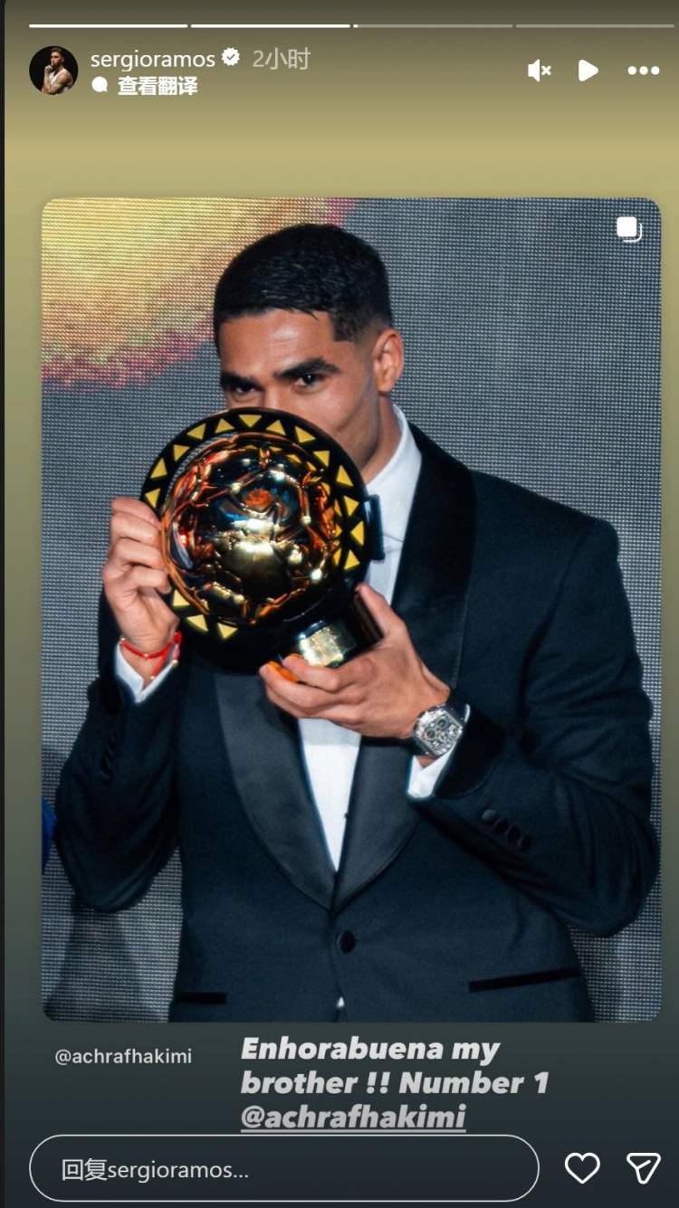 足球比分网11月22日讯 拉莫斯更新社媒动态,祝贺阿什拉夫当选非洲足球先生。 巴黎边卫阿什拉夫当选2025年非洲足球先生,拉莫斯社媒晒出阿什拉夫领奖的照片,配文:“祝贺你,我的兄弟,你是最棒的(Number 1)!” |