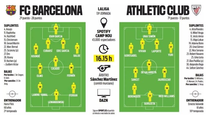 足球比分网11月22日讯 北京时间11月22日23:15,2025-26赛季西甲联赛第13轮,巴塞罗那将坐镇主场迎战毕尔巴鄂竞技。赛前,《每日体育报》撰文分析了弗里克目前的选择,预测了本场比赛球队可能的首发阵容。 《每日体育报》撰文如下: 对于即将到来的在诺坎普球场对阵毕尔巴鄂竞技的比赛,弗里克似乎对首发阵容并没有太多疑问。我们需要看看他是否也在考虑周二在伦敦的比赛,还是只专注于用所有可用球员击败这支巴斯克雄狮。 德容和佩德里的缺阵自然会极大地打乱他的计划。因此,中场的选择余地不大,阵容似乎也比较明确。唯一令人意外的是,他是否会像对阵奥林匹亚科斯和皇家社会那样,让德罗首发,或者让伯纳尔首发。伯纳尔近期代表加泰罗尼亚队出战了45分钟,此前也参加了预备队的训练赛,但看起来弗里克并不认为他已经做好了首发的准备,我们需要看一看。 种种迹象表明,中场将由奥尔莫、卡萨多和费尔明组成。奥尔莫将扮演佩德里的角色,于卡萨多搭档双后腰。费尔明则会像近几周表现出色那样,担任进攻型中场。由于拉什福德因流感出战成疑,一切迹象都表明费兰·托雷斯将首发担任左边锋,与莱万多夫斯基和亚马尔组成进攻三叉戟。 费兰·托雷斯本赛季更多地担任中锋,但这次他需要与莱万搭档,这位波兰前锋在塞尔塔上演帽子戏法后状态极佳。与此同时,亚马尔在接受耻骨痛射频治疗并缺席西班牙国家队比赛后,本周训练状态良好。 疑虑主要集中在中后卫位置。库巴西和埃里克·加西亚略占优势,因为阿劳霍随乌拉圭队征战后,长途跋涉返程,于本周四早上抵达,或许弗里克更倾向于将他留到伦敦的欧冠比赛中使用。 门将位置上的决定将毫无争议,自9月25日对阵奥维耶多的比赛以来一直缺阵的霍安·加西亚将首发,在他缺阵期间未能零封对手的什琴斯尼将再次成为替补门将。 《每日体育报》预测巴萨首发: 门将:霍安·加西亚 后卫:孔德、库巴西、埃里克·加西亚、巴尔德 中场:奥尔莫、卡萨多、费尔明 前锋:亚马尔、莱万、费兰·托雷斯 |