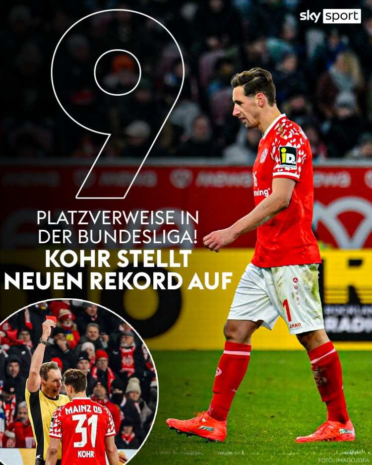 美因茨后卫科尔德甲第9次被出示红牌,成为德甲
