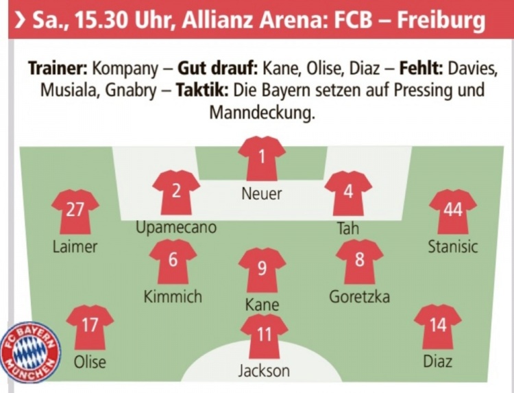足球比分网11月22日讯 拜仁将在本轮德甲焦点战坐镇主场对阵弗赖堡,德媒《慕尼黑日报》也预测了拜仁首发。 德媒预测拜仁首发: 诺伊尔/莱默尔、于帕梅卡诺、若纳坦·塔、斯坦尼西奇/基米希、格雷茨卡/奥利塞、凯恩、迪亚斯/杰克逊 |