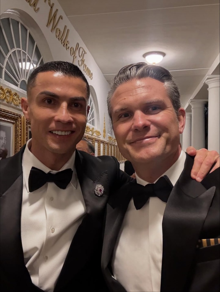 足球比分网11月21日讯 美国战争部部长赫格塞斯在个人社交媒体发布了一系列照片动态,其中包含一张晚宴期间与C罗的合影。 照片中,C罗与赫格塞思手搭着肩,笑容灿烂。 C罗本周携未婚妻乔治娜亮相白宫,与美国总统特朗普会面并出席了晚宴。