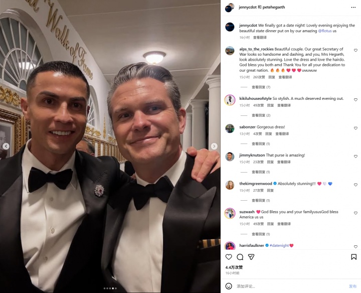 C罗与美国防长合影,西装革履出席白宫晚宴