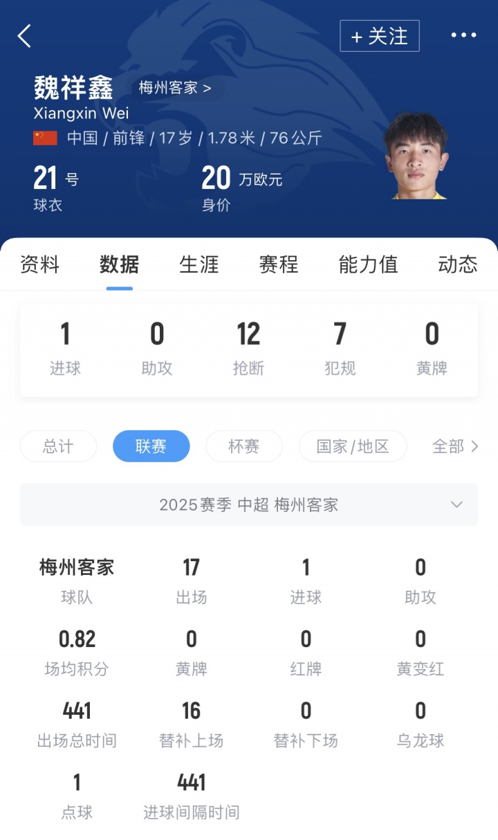 魏祥鑫2008年3月出生于“足球之乡”广东梅州,8岁加入梅州客家青训体系。凭借高度的自律与不懈的拼搏,他逐渐成长为一名速度出众、对抗能力强、门前嗅觉敏锐的锋线球员。此前,他曾入选英国《卫报》评选的“2025年度全球最具潜力60大新星”榜单,是其中唯一的中国球员,被视为中国足球新生代中的标杆人物。