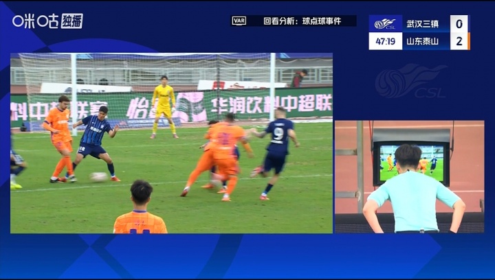 足球比分网11月22日讯 泰山vs三镇第49分钟,泽卡禁区内倒地,裁判亲自回看VAR,泰山获得点球! 瓦科点射破门,赛季3次罚点终于命中!泰山3-0领先三镇!