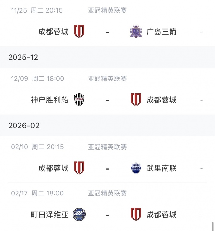 成都蓉城,上轮亚冠精英联赛战平首尔FC,目前亚冠1胜1平2负积4分暂列小组第11,还剩4轮亚冠精英联赛比赛。