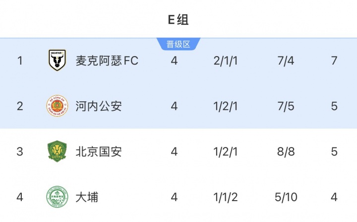北京国安上轮亚冠二级联赛3-0大胜大埔,保留晋级淘汰赛希望,目前在亚冠二级E组1胜2平1负,和小组第二河内公安队同积5分,暂列E组第3。