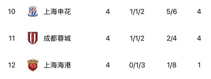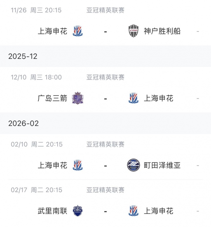 上海申花,上场亚冠精英联赛1-3输给柔佛新山,目前亚冠1胜1平2负积4分暂列小组第10,还剩4轮亚冠精英联赛比赛