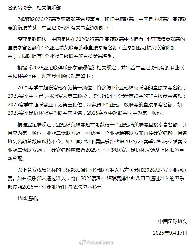 随着中超落幕,2026-27赛季亚冠联赛中国球队参赛资格也基本确定了。下赛季亚冠起,中超是1+1+1个名额,中超冠军上海海港将直接参加亚冠精英联赛;中超亚军上海申花将参加亚冠二级联赛。另有一个亚冠精英联赛的附加赛名额是给今年足协杯冠军的,将由河南和北京国安于12月6日决出。 当然了,各队首先还要过亚冠的准入牌照审查之后,才能正常参赛。