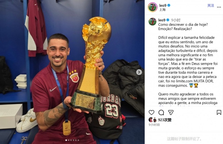 足球比分网11月23日讯 2025赛季中超落下帷幕,上海海港连续三个赛季夺得中超冠军。 上海海港前锋莱昂纳多在社媒写道:“我该如何形容今天?是激动?还是成就? 我难以用言语表达此刻的喜悦,这一年充满了挑战。起初,我经历了一段动荡而艰难的适应期,之后取得了显著的进步,但最终却遭遇了伤病,几乎‘耗尽了我的所有精力’。但我对上帝的信仰始终坚定不移,我的职业生涯也一直全力以赴,我绝不会让一切功亏一篑。我曾一度濒临崩溃,承受着巨大的痛苦,但我们做到了! |