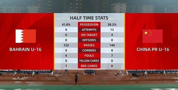 足球比分网11月22日讯 U17亚预赛第一轮,国少队半场3-0领先巴林队,数据方面,国少队半场13射4正3进球,对手0射门。 附国少队vs巴林半场数据(巴林在前): 控球率:41.8%vs58.2% 射门:0次vs13次 射正:0次vs4次 越位:0次vs0次 传球:122次vs140次 角球:0次vs8次 黄牌:0张vs0张 红牌:1张vs0张