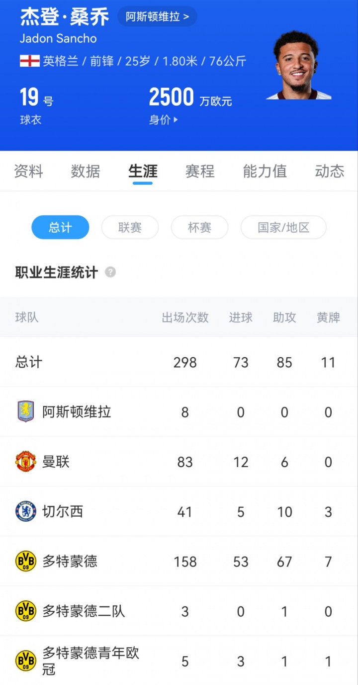 足球比分网11月23日讯 《镜报》独家报道称,目前被曼联外租至维拉的桑乔未来有望再度加盟多特,他们热衷于第3次签下他(2017年从曼城梯队买入、2024年冬窗租借),但需要球员进行大幅降薪。 桑乔已经被告知,如果想回到多特,就必须将30万英镑的周薪减半。球员急于找到一家能帮助他重振职业生涯的球队,他知道自己最好的时光是在多特,但多特高层们已经明确表示,他目前的合同对他们来说并不划算。 科贝尔目前是多特薪资最高的球星,周薪约15万英镑。桑乔必须遵守多特的工资结构,才能重返老东家。 目前桑乔与曼联的合同已经进入最后一年,他可以在明年自由离队,此前罗马诺报道称曼联并不打算与他进行续约。桑乔可以在一月份开始与有意免签他的球队进行联系。