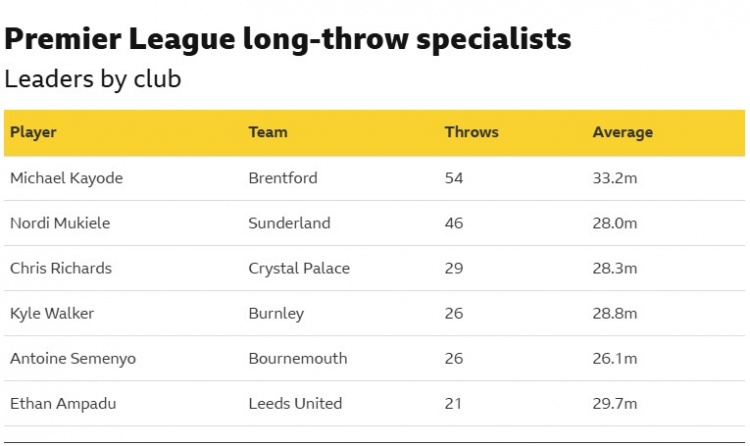足球比分网11月22日讯 曾经,长距离手抛球似乎只属于托尼-普利斯的斯托克城,但现在几乎每支英超球队都在使用这一战术并且效果显著。上赛季,英超球队通过手抛球战术打入了20个进球。而本赛季仅进行了11轮比赛,就已经有12个进球来自这种方式。 此外,手抛球的平均距离也在增加。两个赛季前为16.5米,上赛季为16.7米,而本赛季则跃升至18.6米。Opta定义超过20米的掷球为长距离手抛球,因此目前的平均掷球距离正在接近这个标准。 Opta盘点了本赛季英超球员手抛球数量情况,布伦特福德的卡约德以54次居首,平均距离达到了33.2米。位居其后的是桑德兰的穆基勒(46次,平均距离28米),水晶宫的克里斯-理查兹(29次,平均距离28.3米),伯恩利的凯尔-沃克(26次,平均距离28.8米),伯恩茅斯的塞梅尼奥(26次,平均距离26.1米),利兹联的阿姆帕杜(21次,平均距离29.7米)。