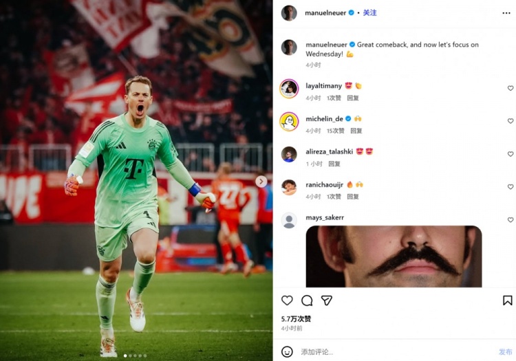 欧冠将战阿森纳!诺伊尔社媒:伟大的逆转!现