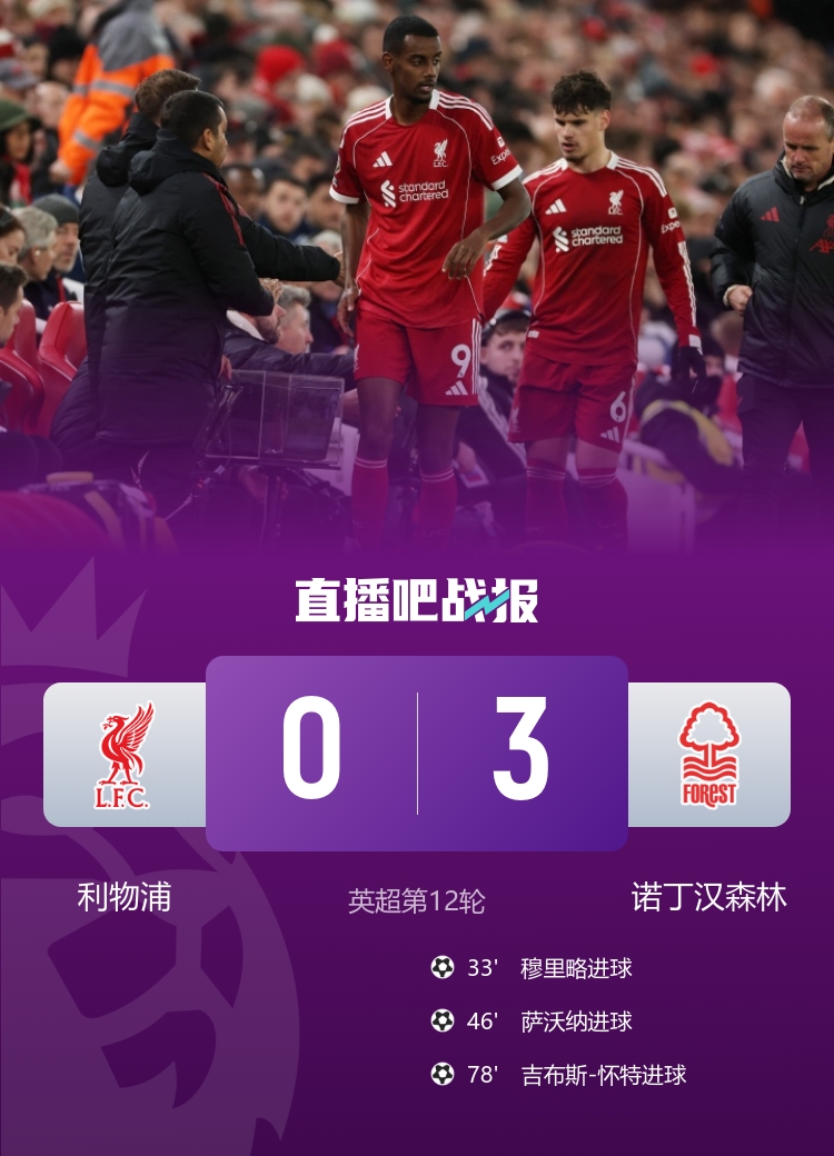 【比赛战报】 近7轮遭6负!利物浦0-3森林跌至第11名 红军全场21脚射门未果