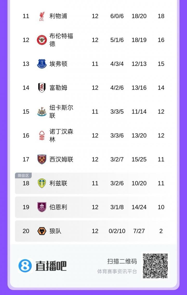 足球比分网11月23日讯 英超第12轮,利物浦主场0-3不敌森林,排名跌至第11名。 利物浦本赛季英超已输掉6场,他们上赛季整赛季才输4场。此外,利物浦打进18球却丢了20球,净胜球已是-2。