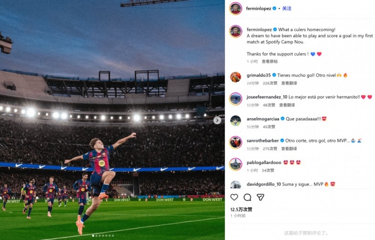 足球比分网11月23日讯 巴萨在本轮西甲4-0完胜毕巴,费尔明取得进球并在赛后被西甲官方评为全场最佳。 第48分钟,埃里克·加西亚弧顶送出直塞,这球碰到防守球员有点减速,不过前插的费尔明还是将球得到,一脚打门洞穿乌奈·西蒙十指关。 费尔明本场2射2正进1球并送出1次关键传球,14次对抗5次成功且3造犯规,他也在赛后被西甲官方评选为本场最佳球员。 费尔明也在赛后通过社媒晒出自己的激情庆祝照,并配文:“多么精彩的巴萨回家之战!能在诺坎普球场出场并进球,简直像做梦一样!感谢巴萨球迷的支持!” |