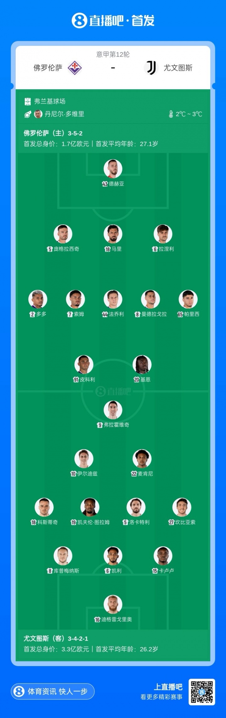 尤文vs佛罗伦萨首发:弗拉霍维奇、伊尔迪兹、科