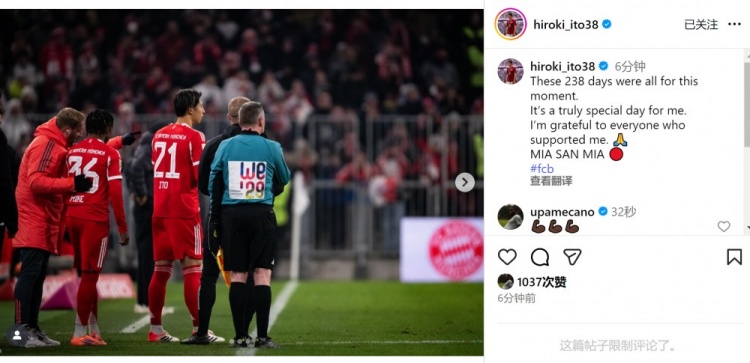 足球比分网11月23日讯 德甲第11轮比赛,伊藤洋辉替补出场上演复出首秀,并送出助攻,帮助拜仁主场6-2击败弗赖堡。 伊藤洋辉赛后在社交媒体上写道:“这238天,都是为了这一刻。 对我来说这真的是一个特别的日子。 感谢所有支持过我的人 |