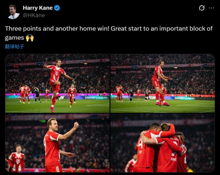 凯恩社媒晒庆祝照:主场3分到手!一段关键赛程