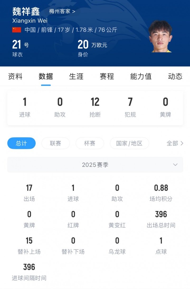 直播吧:梅州客家17岁前锋魏祥鑫即将留洋法甲欧