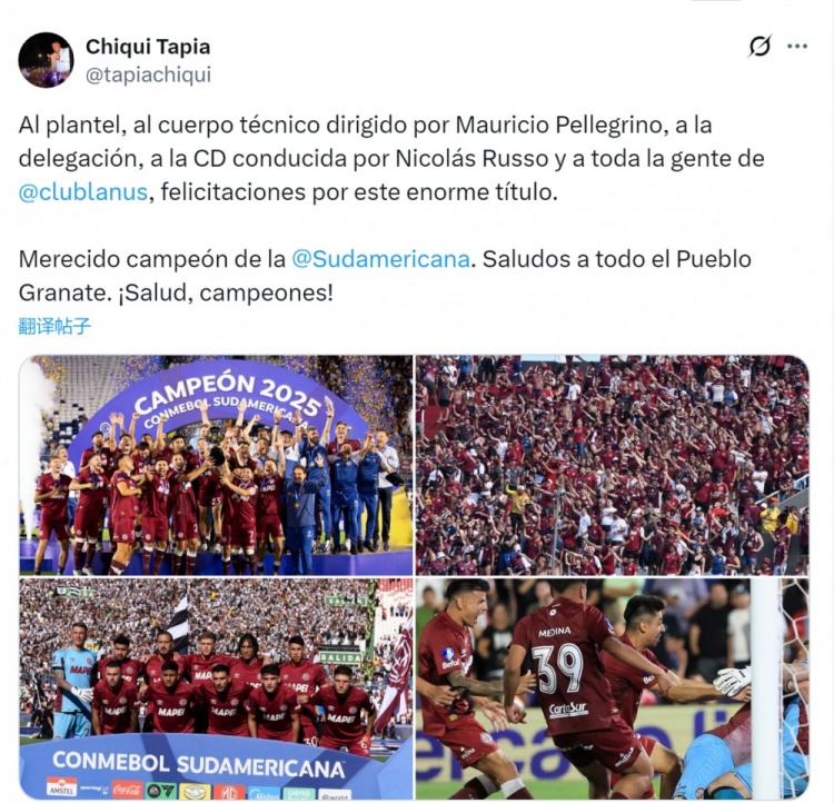 拉努斯问鼎南美杯,阿根廷足协主席塔皮亚社媒