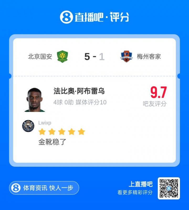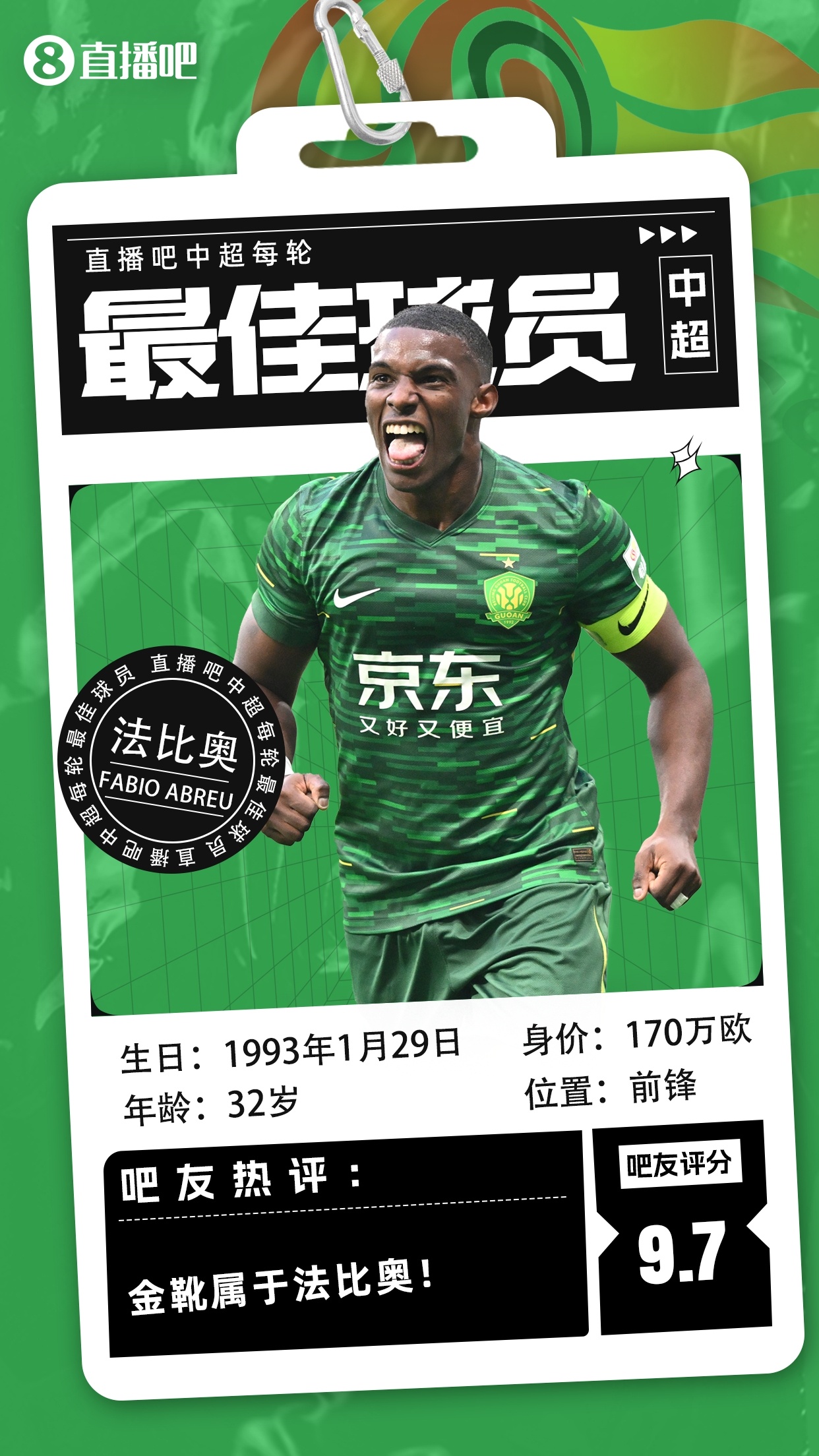 为什么没有评选?就直接当选,因为法比奥大四喜夺得联赛金靴! 中超收官战,法比奥上演大四喜,帮助北京国安主场5-1大胜梅州客家,个人也以30场28球成为本赛季中超金靴,本轮最佳实至名归!
