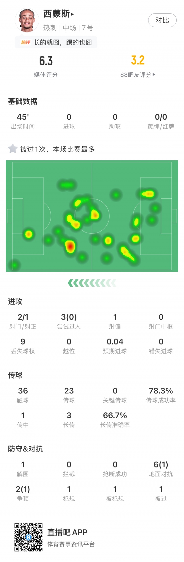 足球比分网11月24日讯 英超第12轮北伦敦德比,阿森纳4-1热刺,埃泽上演帽子戏法。 今夏热刺原本要签下埃泽,但遭到阿森纳的截胡,转而6500万欧签下哈维·西蒙斯。“儿厂梦”的埃泽以6930万欧从水晶宫转投枪手。 西蒙斯此役下半场替补登场,2次射门1次打正,3次尝试过人0成功,0关键传球,6次地面对抗1成功。 西蒙斯上赛季在莱比锡的时候,德甲25场10球6助,来到英超之后明显还不适应,目前英超9场0球1助。