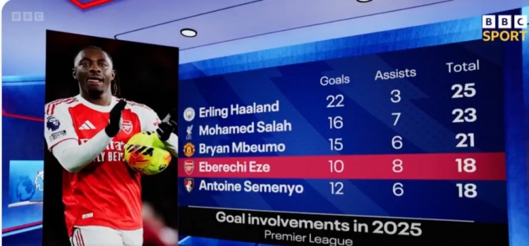 足球比分网11月24日讯 英超第12轮比赛,埃泽上演帽子戏法,阿森纳主场4-1击败热刺。 据BBC统计,埃泽今年英超参与18粒进球,仅少于哈兰德、萨拉赫、姆伯莫。 2025年英超参与进球排名: 哈兰德——25 萨拉赫——23 姆伯莫——21 埃泽——18 塞梅尼奥——18 |