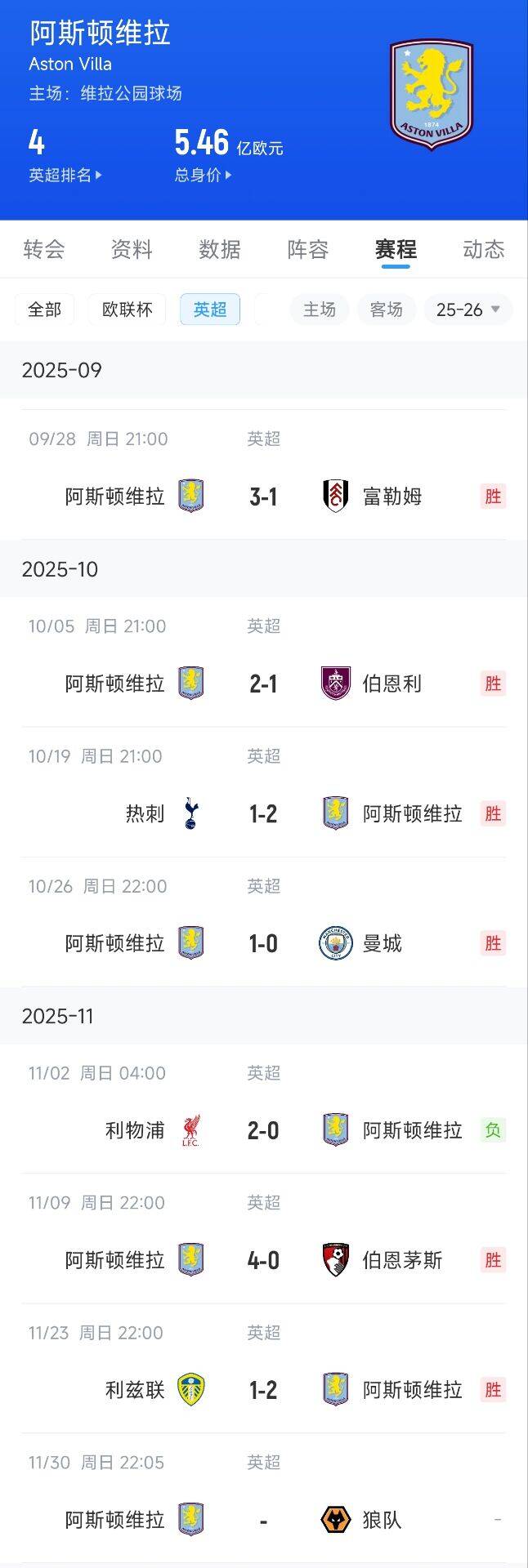 一路向北!维拉7轮6胜狂砍18分从保级区冲到第