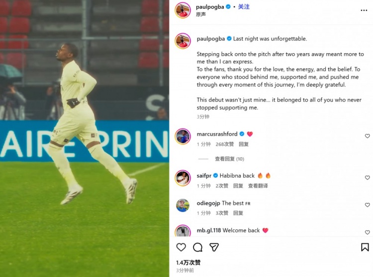 博格巴社媒:时隔2年重返球场对我意义非凡 感谢