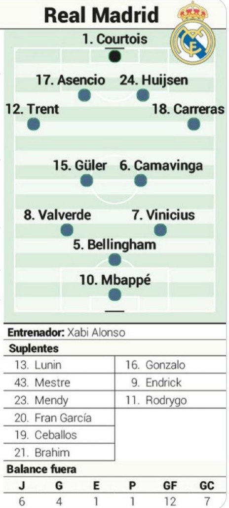 足球比分网11月23日讯 北京时间明天凌晨4点,皇马将在西甲第13轮比赛中客场对阵埃尔切。《阿斯报》预测了皇马此役的首发阵容。 阿斯报预测皇马对阵埃尔切首发 门将:库尔图瓦 后卫:阿诺德、阿森西奥、赫伊森、卡雷拉斯 中场/边锋:居莱尔、卡马文加、巴尔韦德、维尼修斯、贝林厄姆 前锋:姆巴佩