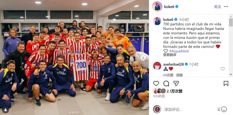 足球比分网11月24日讯 西甲第13轮比赛,科克首发出战,帮助马竞客场1-0击败赫塔费。 此役是科克为马竞出战的第700场比赛,他总计为马竞打进48球,助攻121次,赛后科克获赠纪念球衣。 科克社媒晒出手拿700场纪念球衣与全队的合照,配文:“为我一生挚爱的俱乐部出战700场比赛,我从未想过自己能走到这一步,但我做到了,怀着与第一天相同的热忱。感谢所有陪伴我走过这段旅程的人。” |