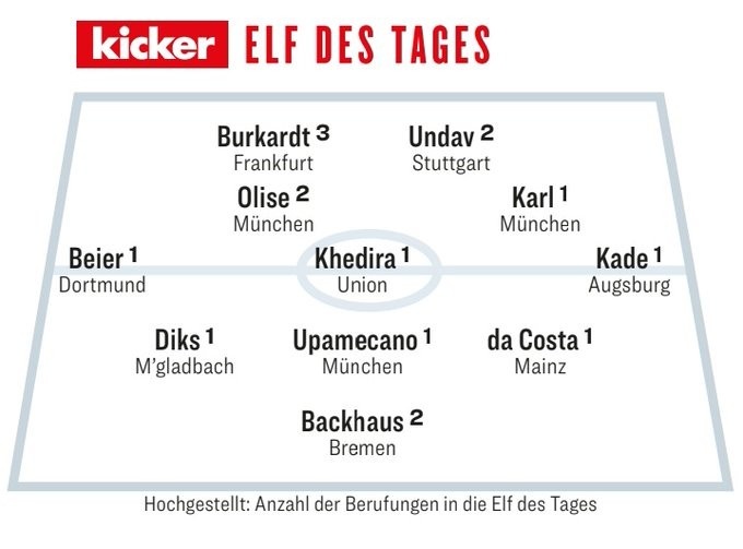 踢球者德甲本周最佳阵:拜仁小将卡尔首次入选