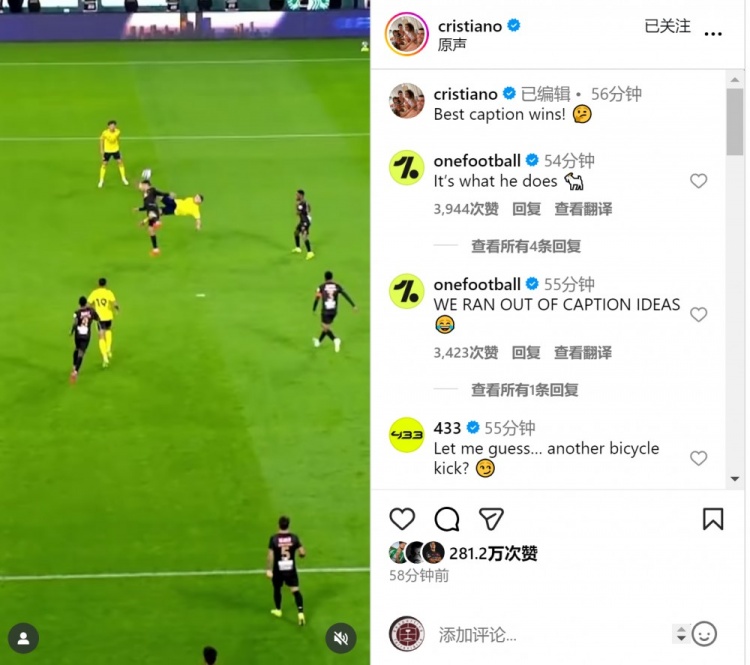 精彩绝伦!C罗赛后社媒晒倒钩破门视频