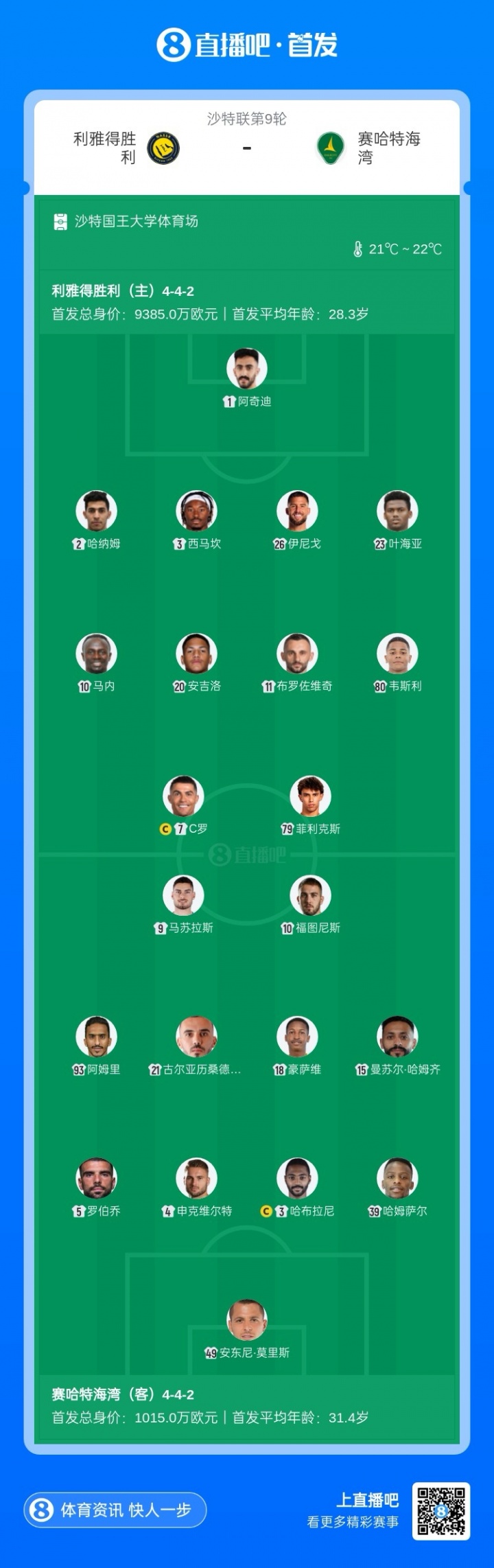利雅得胜利vs赛哈特海湾首发:C罗、菲利克斯、