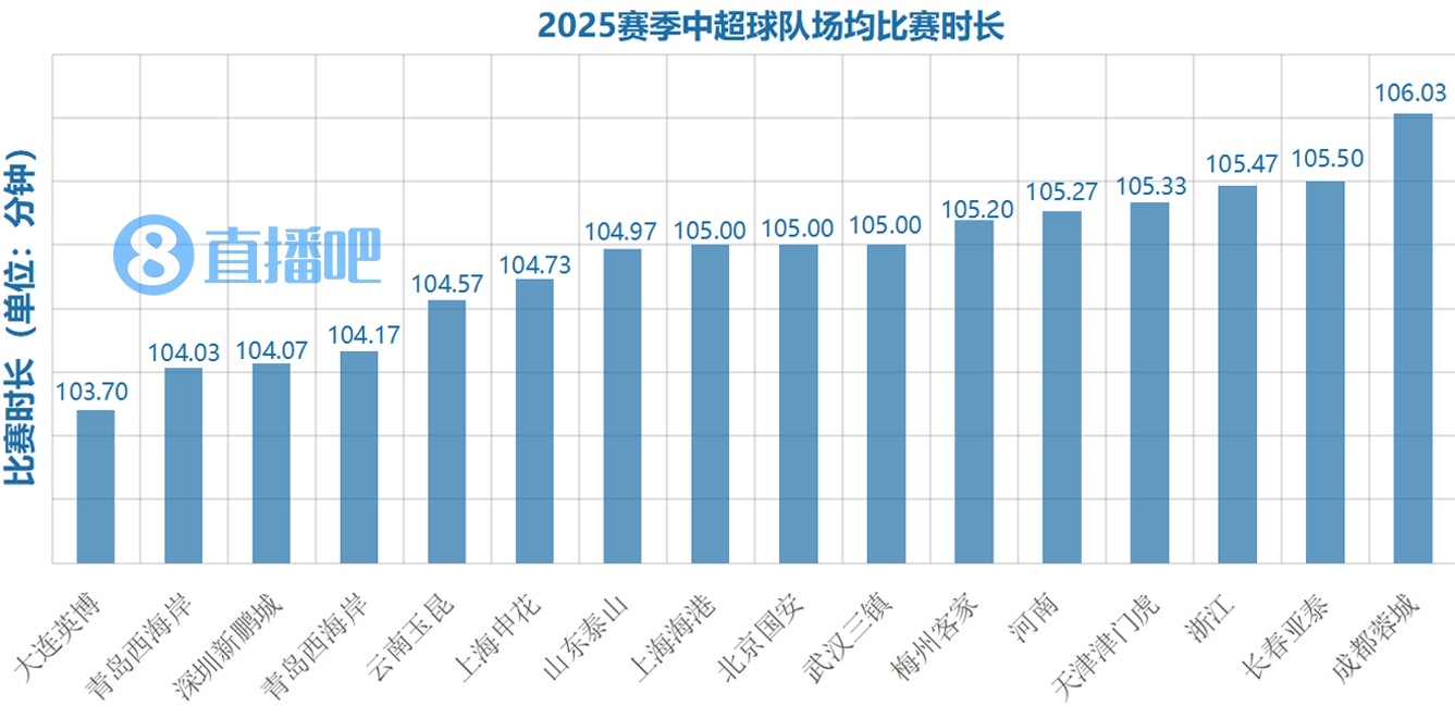 图:2025赛季中超16支球队场均比赛时长 自2024赛季开始,中超联赛就推出了“精确补时”制度,针对受伤球员治疗、换人、点球、红牌、庆祝进球以及VAR介入等要求严格计时,因此比赛的补时都有所增加。 根据数据统计2025赛季中超16支球队的场均比赛时长都超过了100分钟,270场比赛场均比赛时长为104.87分钟; 赛季平均比赛时长最短的球队为大连英博103.70分钟,平均每场比赛上半场总补时时间为13.70分钟; 赛季平均比赛时长最长的球队为成都蓉城达到了106.03分钟,平均每场比赛总补时时间为16.03分钟。