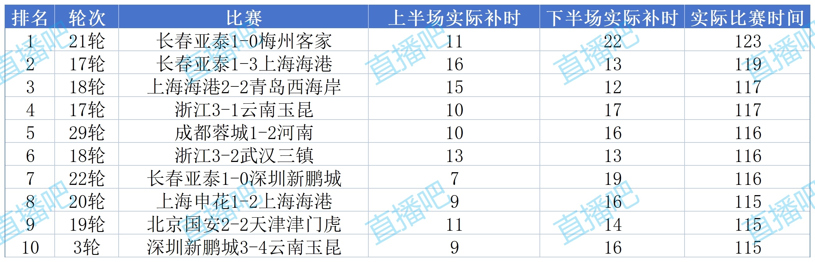 图:2025赛季实际比赛时长最多的比赛 小吧也统计了本赛季实际比赛时长最多的10场比赛,其中中超第21轮长春亚泰主场1-0战胜梅州客家的比赛,全场实际比赛时间达到了123分钟,上下半场补时总时长达到了33分钟(上半场补时11分钟+下半场补时22分钟)。而在这10场时间超长的比赛中,长春亚泰主场的有三场。 足协评议错判漏判