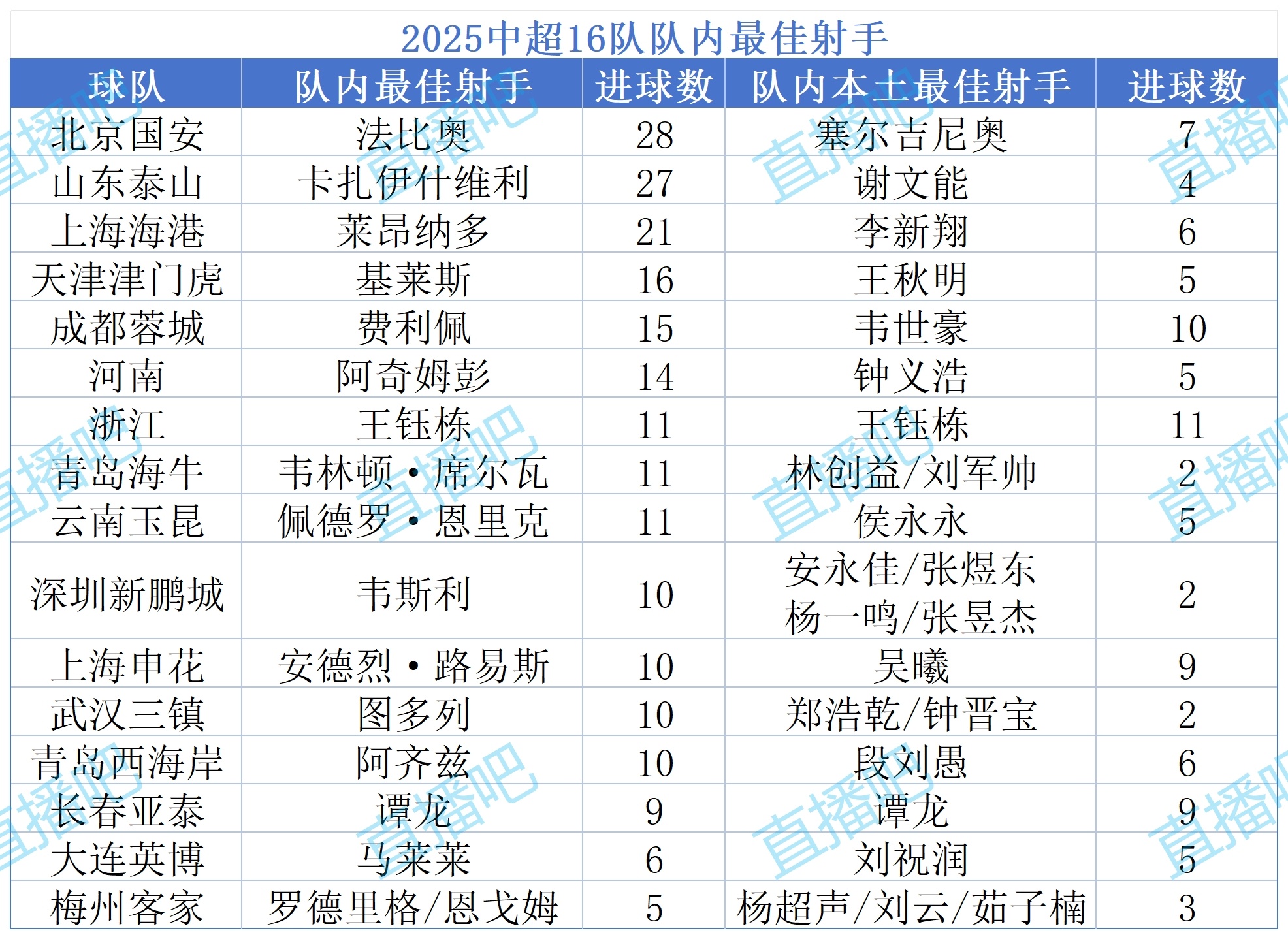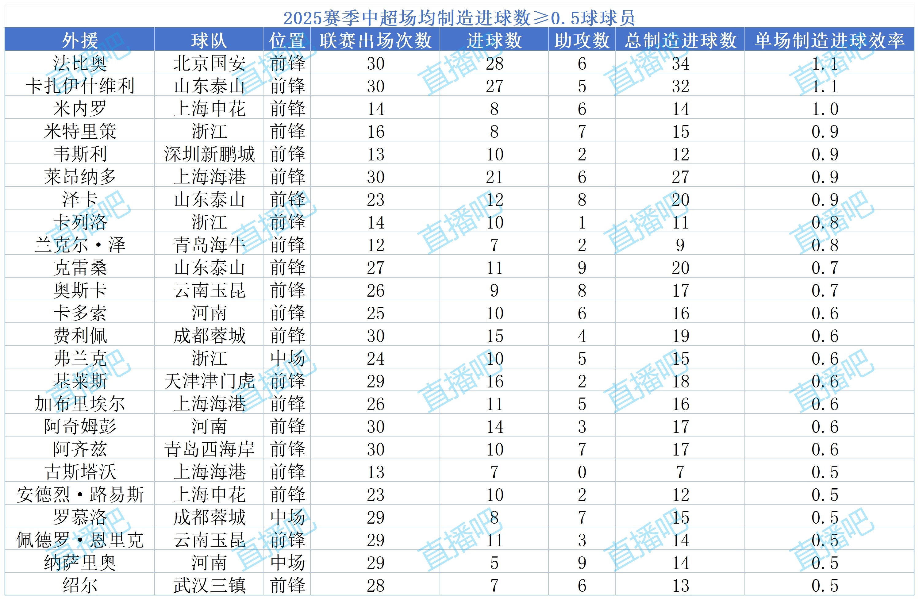 图:2025赛季中超场均制造进球数≥0.5球球员 中超16支球队,除浙江(王钰栋12球)&长春亚泰(谭龙9球)外,其他14支球队的队内最佳射手皆为外援,队内最佳射手进球最多的是北京国安外援法比奥28球,队内最佳射手进球最少的是梅州客家罗德里格/恩戈姆5球。