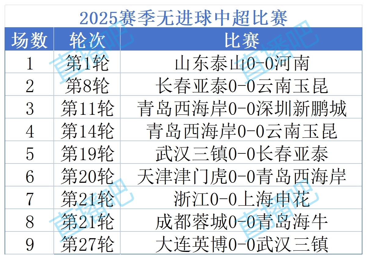 图:2025赛季单场进球数≥6比赛 那么有没有没有进球的比赛呢?根据统计本赛季一共有9场比赛没有产生进球,青岛西海岸是0-0场次最多的球队,达到了3场。