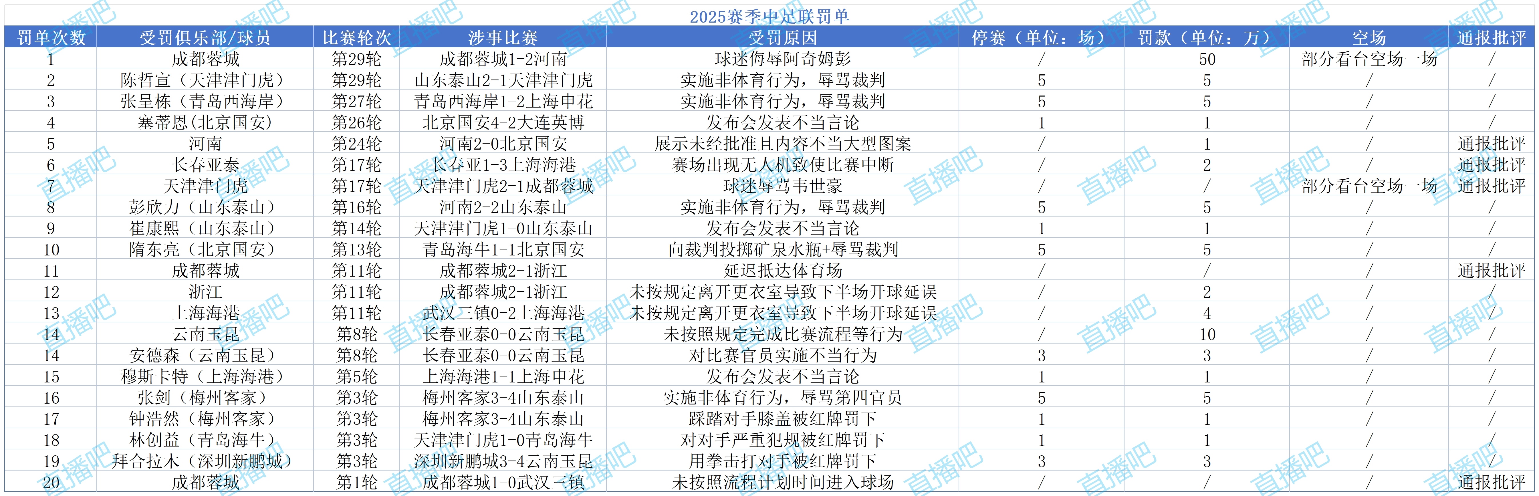 本赛季中足联发布罚单20张,球员/球队官员辱骂裁判是重灾区,有5名球员(含球队官员)因为辱骂判罚被禁赛5场+罚款5万。 本赛季罚款金额最大的罚单,是因为成都蓉城球迷侮辱歧视河南外援阿奇姆彭,前者因为极端球迷的不当行为被罚款50万。 |