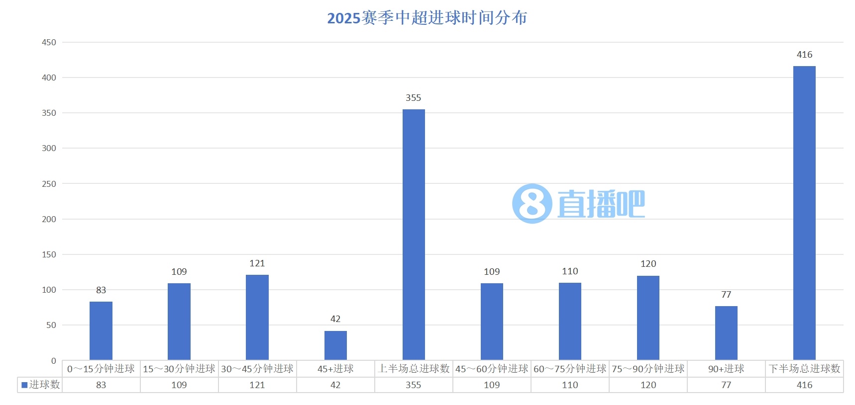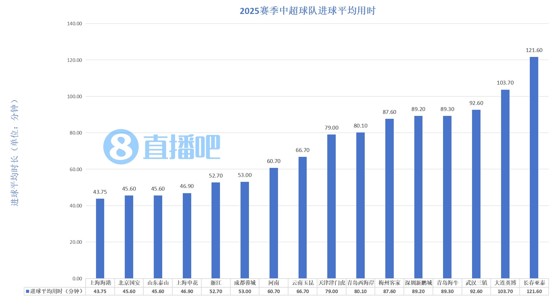 图:2025赛季中超球队进球平均用时 进球时间分布