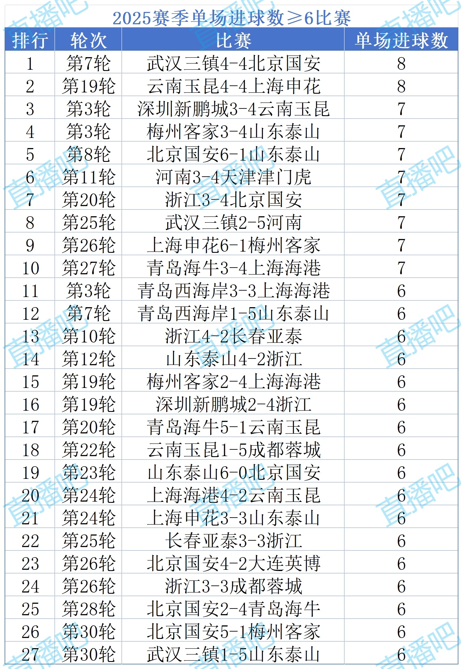 图:2025赛季各队总丢球数&场均丢球数 如上所述,本赛季场均进球3.21个不算少,这得益于本赛季多场比赛踢出大比分。 根据数据统计,本赛季总进球数≥6的比赛一共有27场,进球最多的比赛是第7轮武汉三镇4-4北京国安、第19轮云南玉昆4-4上海申花,两场比赛的进球数都达到了8球。在这27场比赛中,北京国安和山东泰山是出现次数最多的球队,这两支球队分别参与了7场比赛。