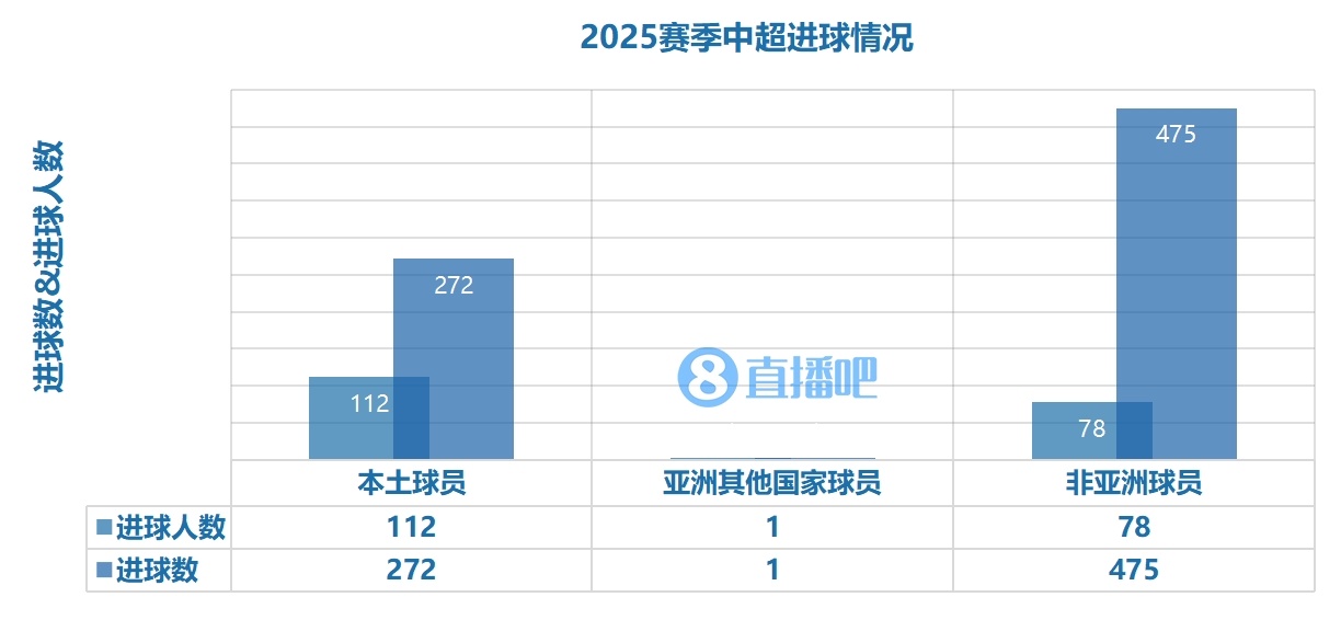 图:2025赛季中超进球球员地区分布情况 本赛季771球由192名球员打进,其中本土球员112人一共打进272球,占总进球数35.27%; 亚洲其他国家球员只有1位外援且取得进球(武汉三镇韩国外援朴志洙1球); 非亚洲球员进球人数79人一共打进475球,占总进球数61.16%;