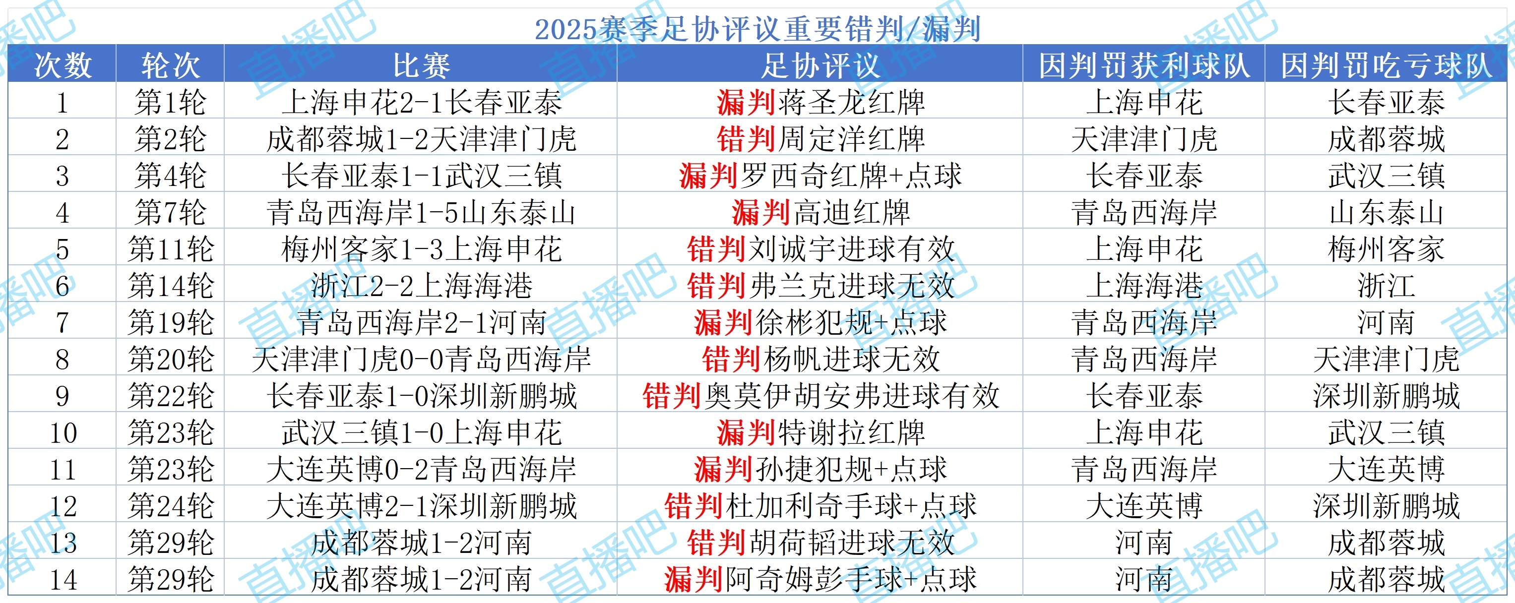 图:2025赛季足协评议重要错判/漏判汇总 根据本赛季中国足协发布的裁判评议,对于影响比赛走势的红牌、点球、进球错判/漏判,出现了14起。 因判罚获利的球队青岛西海岸居首(4次),因判罚吃亏的球队成都蓉城居首(3次)。 比较严重的错判漏判,出现在联赛第29轮成都蓉城1-2河南的比赛,这场比赛中成都蓉城遭遇2次错判/漏判, 中足联罚单