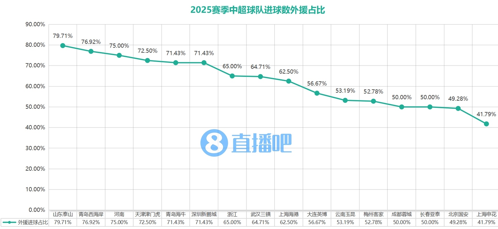 图:2025赛季球队总进球数&外援进球数和占比 本赛季外援进球最多以及外援进球占比最多的球队都是山东泰山,本赛季山东泰山一共打进69球,其中外援打进55球占比79.71%;除了北京国安和上海申花,其他14支球队外援占比进球数都≥50%。
